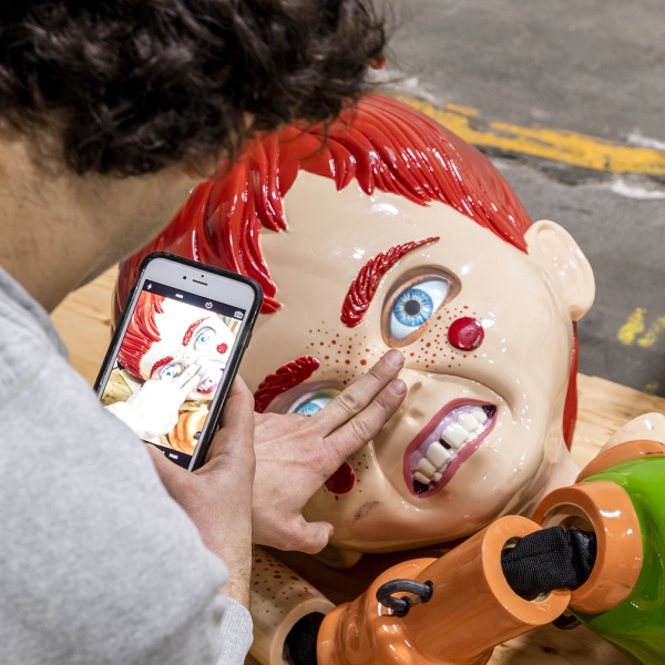 In Wolfson’s installation, the object on display has visual features of a social robot, and in the article on ArtNews, «The Man-Machine: Jordan Wolfson on his Giant New Robot, Hung by Chains at Zwirner», Nate Freeman calls it a «robot» (also identified as « animatronics sculpture», «a figure supposed to represent Huck Finn», «a machine», «humanoid installation», etc.).8 From what a Google search allows me to gather, Wolfson’s robot is preponderantly organized and engaged around gaze, while the rest of the modalities are largely disregarded. First, the robot embeds facial recognition technology so that it can appear as exchanging gazes and following visitors around the gallery; I will return to this point later in this section. Second, the piece is about its distanced viewing on the part of its human visitors, mainly conceived as a spectacle. The centrality of this intense gazing is illustrated by the image that announced the show and is presently featured on the gallery’s website9, here reproduced in Figure 1. While the majority of the images of Wolfson’s robot do not show humans, this image, as the ArtNews article explains, is of Wolfson taking a photo on his phone of the robot’s head. By the position of the phone that displays an image of the robot’s painful grimace with the artist’s hand gesturing over (or possibly pressing upon) it, the robot is for others to see. While the act of touching the robot may be there to indicate the artist’s relationship with it, the image does not appear to be about that relationship. Rather, the robot is presented as something that those who will see the photo, taken by the artist, can look at (but not engage otherwise).