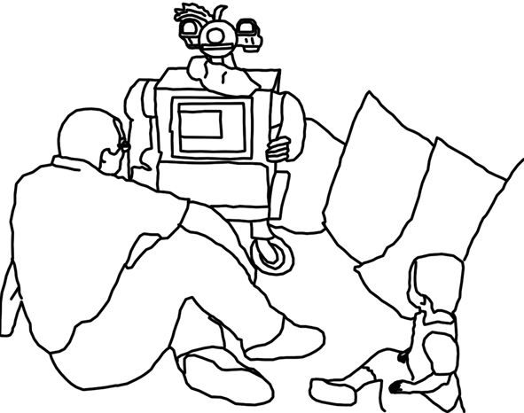 Following the team’s arrival to the preschool, the roboticists engage in a ritual preparation of Area B for a research session. The PI asks one of the educators to keep the children busy elsewhere so that they will join the activity only once the scene has been set up. This organizing of the access to the robot’s proximity (so that the robot can be engaged only in some of its sections and instants of the visit) is already an example of those acts of maintenance that participate in performing the robot in a certain manner. In that moment, the robot is what it is in respect to the reinforcement of the line that divides Area A from Area B.