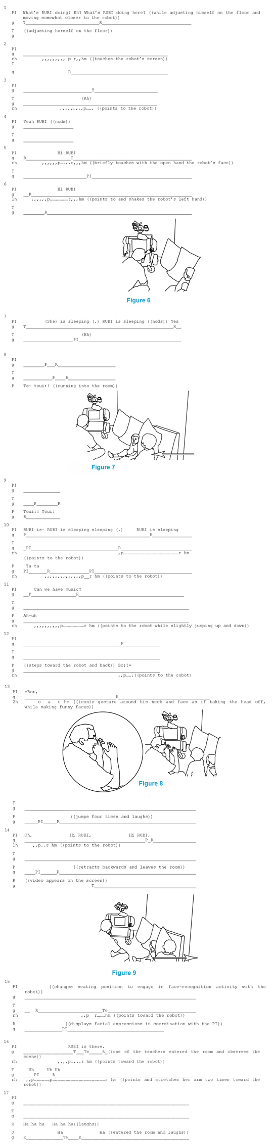 Immersed in the scene, the toddlers initiate acts of shared attention toward the robot. They cheerfully articulate proto-words and direct deictic gestures toward the robot while they show their monitoring of how the PI’s reacts to their moves. In doing so, they can shape the PI’s actions. In line 3, Tansy points while saying «Ah.» In line 10, both Tansy and Perry point while Perry utters «Ta ta.» In line 11, Perry points again while uttering «Ah-uh.» In lines 15 and 16, Tansy enacts a series of indexical gestures while saying «Uh uh uh» (line 16). As the toddlers manifest their excitement toward the robot, the PI readily responds to their actions. Mardi Kidwell and Don Zimmerman emphasized that the acts of shared attention do not only involve drawing and sustaining other’s attention toward an object,56 as suggested by psychologists57. When immersed in social settings, those acts indicate what another should do in response. A child that shows an object to an adult projects a social action that s/he expects the recipient of the show to accomplish. When Perry and Tansy look at the PI while vocalizing and pointing, the PI treats their actions as ‹shows› to which he diligently responds by identifying and appreciating what they are showing. When Tansy utters «Ah» in line 3, the PI responds (line 4) with «Yes RUBI.» When she says «Eh» in line 7, the PI readily answers with «RUBI is sleeping yes» (line 7). Similarly, in lines 4 and 7, Tansy’s «Uh uh uh» (in line 16) is immediately followed by PI’s «RUBI is there.» And when Perry utters «To-toui:!» in line 8, and «Toui:! Toui!» in line 9, the PI repeats «RUBI is- RUBI is sleeping sleeping (.) RUBI is sleeping» (Line 10). When Perry says «Ah-uh» (line 11), the PI cheerfully follows with «Can we have music?» (line 11).