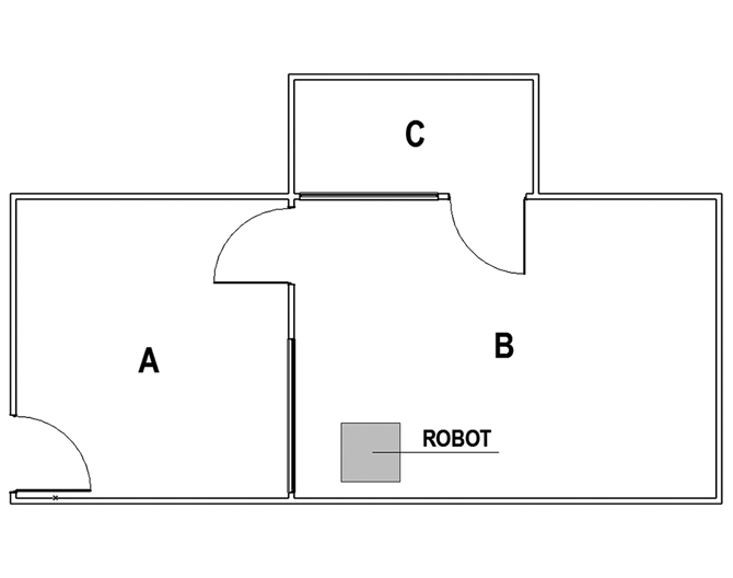 Classroom 1 is a space for two-year-olds to play and learn while their parents are not present. Yet, because the preschool is part of the university, Classroom 1 is also predisposed as a research space. As depicted in Figure 4, the classroom is divided into three areas where the two main areas – Area A and Area B – are connected by a door and a big window. The window allows for a direct monitoring between the two spaces. In addition, there is a small room – Area C – which has a one-way screen opening into Area B. This multifunctional space – both a classroom and an experimental space – is further organized as a setting for research sessions.25 The presence and arrangement of multiple pieces of technology (e.g., the ethnographer’s video camera, the roboticists’ computers and the robot itself), their mingling with the objects that exist in Classroom 1, and the interactional engagements between the research team and the preschool inhabitants articulate the space as a laboratory.26 In that sense, I talk about the preschool as a part of the extended laboratory.