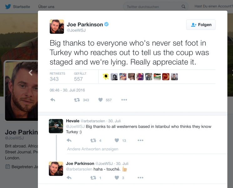 Tweet des Journalisten Joe Parkinson (Screenshot), 30.7.2016