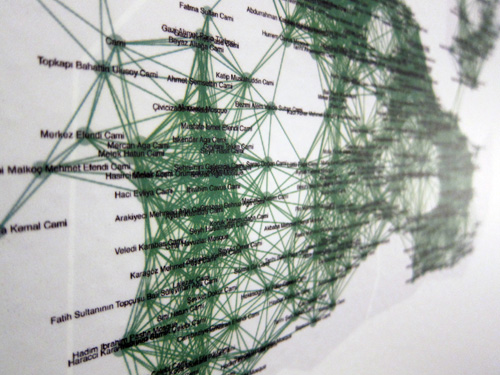 Der türkische Künstler und Techniker Burak Arikan hat bereits in seinen frühen Arbeiten die urbanen Infrastrukturen Istanbuls anhand der Moscheen, Einkaufszentren und nationalen Gedenkstätten kartographiert. Seine Arbeit Islam, Republic, Neoliberalism (2012) wendet eine kritische Methode des Kartographierens an, um vorzuführen, wie Machstrukturen oftmals unbemerkt in den Alltag eingreifen. Aufbauend auf dieser Forschung hat Arikan drei Karten architektonischer Formen erstellt, die zeigen, wie unterschiedliche Architekturen zusammenwirken. Arikan zufolge präsentieren die Karten «a comparative display of network patterns that are formed through associations linking those architectural structures that represent the three dominant ideologies – Islam, Republic, Neoliberalism – in Turkey.» (ebd.)