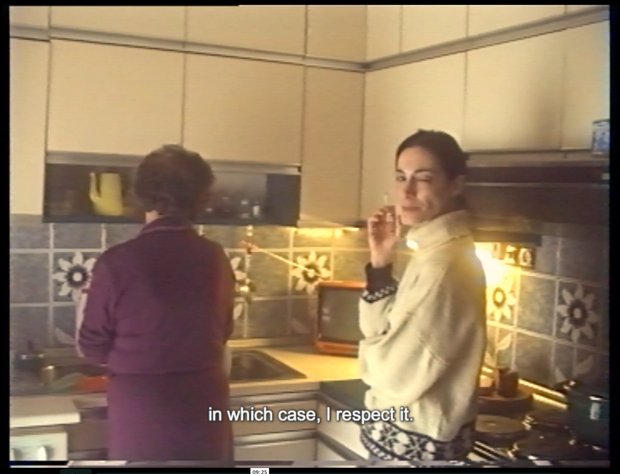 Anthi (Elena Topalidou) guckt in die Kamera und auch knapp daran vorbei. Sie zwinkert mit ihrem linken Auge, als wolle sie der Person hinter der Kamera – und als wäre diese ihr Sohn Kostas – auf vertrauliche Weise ihr Einverständnis darüber anzeigen, ungefragt von ihm gefilmt zu werden, ähnlich wie in einem Home Movie. Anthi ist die Hauptfigur in Thelyia Petrakis Film Bella (2020), der die Briefe einer wirklichen Anthi an ihren Mann Christos (Nikos Kouris) nach Moskau aus den Jahren 1986/87 schauspielerisch, halbdokumentarisch und in zeithistorisch anmutenden Videobildern (mit analogen Zeilensprung-Artefakten) in Szene setzt.3 Spannend verknüpfen sich die im Off-Ton, von der dargestellten Verfasserin gesprochenen, sehnsüchtigen Brieftexte mit Bildszenen, die diese Verfasserin als alleinerziehende Mutter in Athen zeigen: Anthi als Leserin ihrer Briefe trifft auf Anthi als alleinerziehende Mutter zwischen ihren griechischen Freunden und Verwandten, stellenweise flankiert von historischem Newsfeed mit Bildern der Reaktor-Katastrophe in Tschernobyl oder dem Auftritt des US-Präsidenten Ronald Reagan, als dieser vor dem Brandenburger Tor an den Sowjetischen Generalsekretär Gorbatschow appelliert, jenes Tor zu öffnen. Obgleich Bella hinsichtlich eines solchen Wechsels zwischen dokumentarischen und fiktiven Szenen sowie hinsichtlich der Überlagerung von Erzählperspektiven essayistisch wirkt, eignet dem Film eine zielführende Narration, die in der rückwärts laufenden Szene eines romantischen Wiedertreffens der Briefschreiberin mit ihrem Ehemann Christos ihren kulminierenden Wendepunkt findet. Doch mit Christos’ schauspielerischem Auftritt bei diesem Wiedertreffen, wie schon zuvor, als er mit einer anderen Geliebten im Bett zu sehen ist, erfährt die Subjektivierung des Films – bzw. die Ausrichtung seiner ‹Sendung› – eine subtile Verfehlung. Denn als szenisch agierende Figur ist Christos kaum mehr auf seine im Brieftext formulierte Rolle des adressierten, sprich objektivierten Empfängers reduziert.