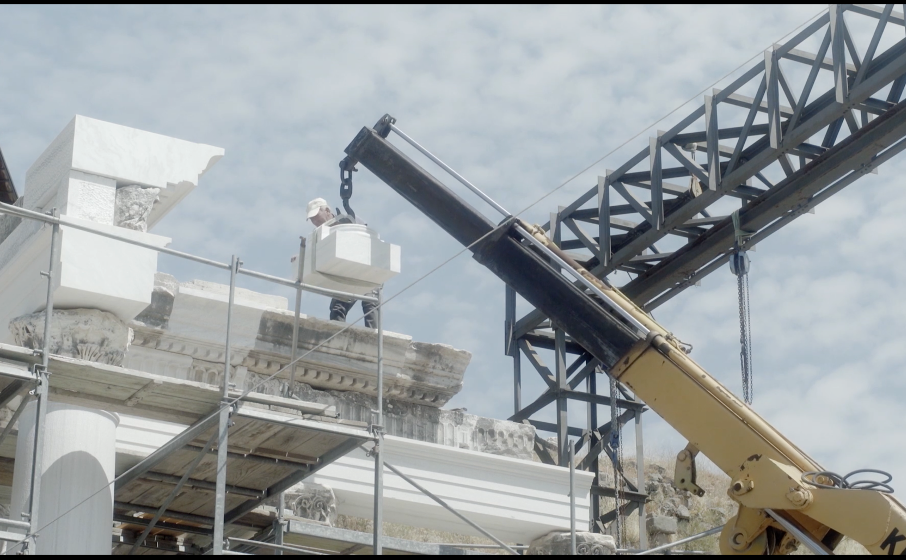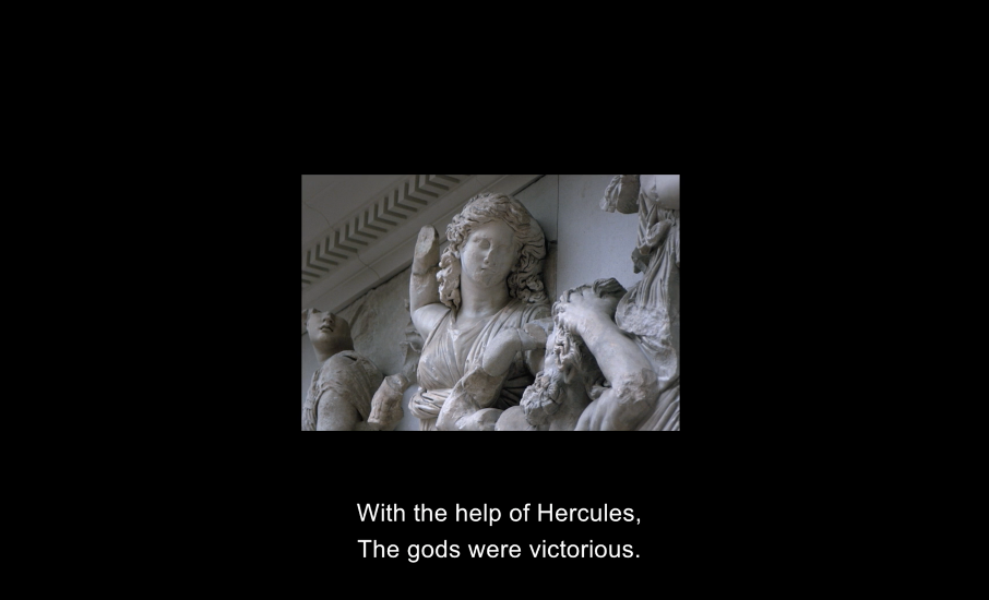 Zu sehen sind antike Ruinen des Tempelgeländes sowie die zu dessen künstlicher Rekonstruktion notwendigen Bau- und Kopierarbeiten. Die dazu von Aslı wie als Brief an ihre Mutter (ohne diese zu nennen) gerichteten Worte fallen über die Bilder aus der Türkei: «First, I’ll give you my new address. Don’t send anything, I’m good. But just so you have it. If you visit, I have a list of museums. But only come when I’ve found a bigger place. I don’t have a guest room. For now. … The neighborhood where I live now was rebuild very quickly after the second world war. And it’s close to the Berlin Wall. The huge Zeus Altar was taken away by the Russians after the war.» Der fast unvermittelte Übergang von Aslıs Informationen über sich selbst zu Informationen über den Altar sind allein durch kurze Pausen und die Montage der Filmbilder moderiert. Als Rede der Filmprotagonistin entsprechen diese Zeilen im Sinne Nacifys einem Filmbrief. Gleichwohl reflektieren sie die Struktur des Films insgesamt. Denn es sind genau die Spaltungen und Aufteilungen der diversen kommunikativen Positionen, die Other Than That, I’m Fine variiert, sowohl diejenigen zwischen Absender_innen und Adressat_innen, wie auch solche innerhalb dieser Subjekte selbst bzw. der von ihnen mit/geteilten Informationen. Die migrierende Zugehörigkeit der Hauptfigur reflektiert sich keineswegs metaphorisch einseitig an der Deterritorialisierung des Pergamonaltars. Aslıs Informationen zu Adresse, Besuch, Wiederaufbau und Gästestatus lassen sich in beide Richtungen interpretieren, sowohl in Bezug auf die der Rollenfigur zukommenden Biografie wie auch hinsichtlich der den Pergamonaltar betreffenden Herkunftsgeschichte und Restitutionsansprüche. Dass Aslıs Mitteilungen sich somit auf verschiedene Bedeutungsfelder gleichmäßig verteilen, relativiert zwar für jedes einzelne Feld ihre dringliche Gültigkeit; anderseits verleiht die mit einer solchen spielerischen Ambivalenz einhergehenden Echowirkung beiden Interpretationsmöglichkeiten eine nachhaltige Bedeutung.