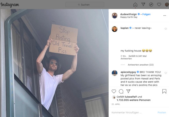 Abb. 3: dudewithsign: Stop Posting Old Travel Pics. Instagram, Screenshot FW, Stand: 22.04.2020